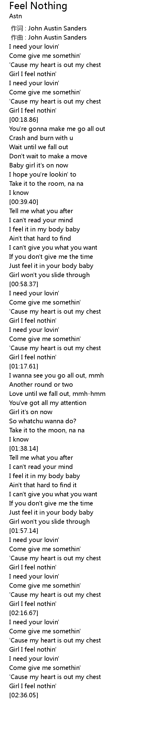 | [02:33.83] | Girl I feel nothin' |