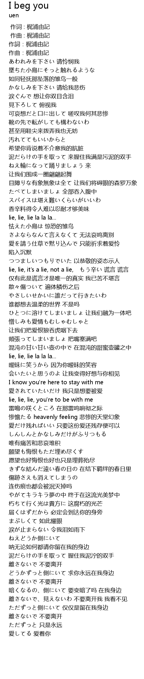 | [01:21.198] | lie, lie, it's a lie, not a lie, もう辛い 谎言 谎言 仅有此是谎言才是唯一的真实 我已苦不堪言 |
