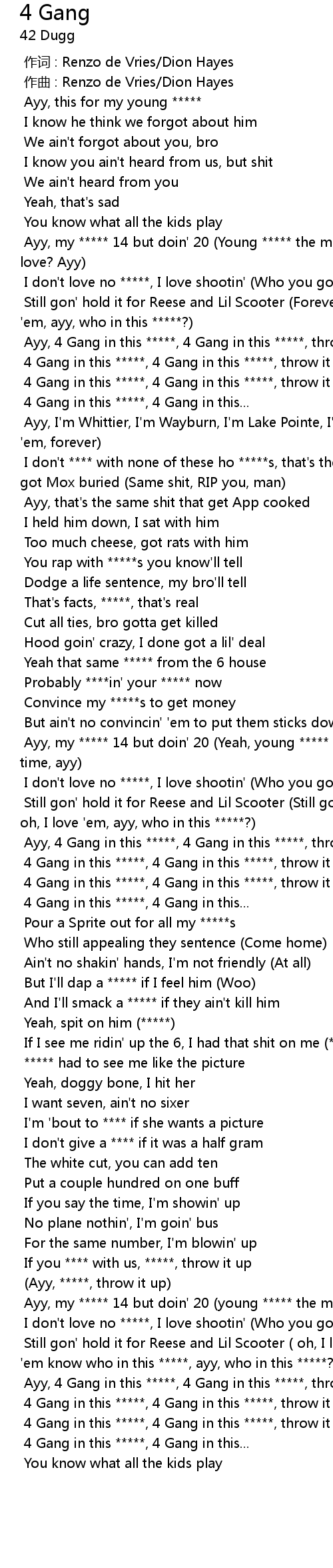 | [01:35.647] | 4 Gang in this *****, 4 Gang in this *****, throw it up |