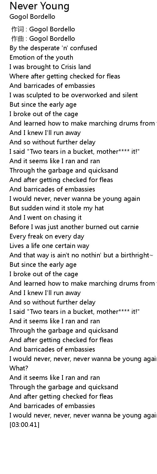 | [00:00.018] | 作曲 : Gogol Bordello |