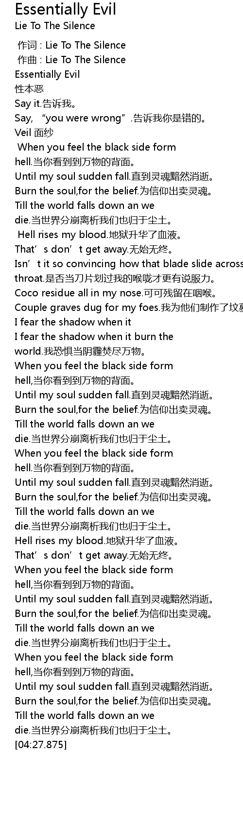 | [04:11.550] | Till the world falls down an we die. dāng shì jiè fēn bēng lí xī wǒ men yě guī yú chén tǔ. |