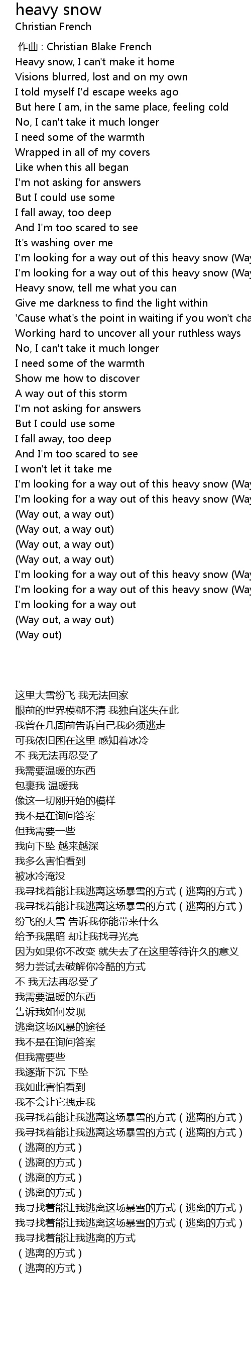 | [03:07.02] | I'm looking for a way out of this heavy snow (Way out, a way out) |