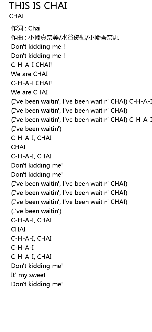 | [00:43.172] | (I've been waitin', I've been waitin' CHAI) C-H-A-I |