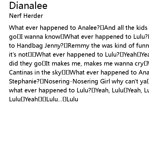 | What ever happened to Analee? And all the kids on Geno Street Where did they go I wanna know What ever happened to Lulu? Yeah What ever happened to Handbag Jenny? Remmy the was kind of funny The scene was hot And now it' s not What ever happened to Lulu? Yeah Yeah Yeah, Lulu Where did they go It makes me, makes me wanna cry We' ll meet again At the Alex' s Cantinas in the sky What ever happened to Analee? Kelly, Hustle, and Stephanie? NoseringNosering Girl why can' t ya Help me find Diana And what ever happened to Lulu? Yeah, Lulu Yeah, Lulu Yeah, Lulu Yeah Lulu... Lulu |
