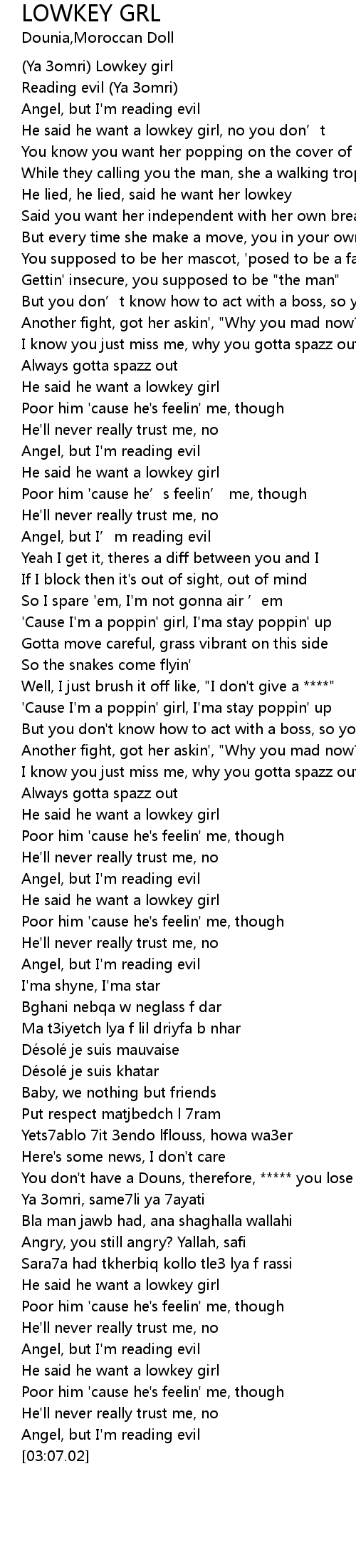 | [00:00.28] | (Ya 3omri) Lowkey girl |