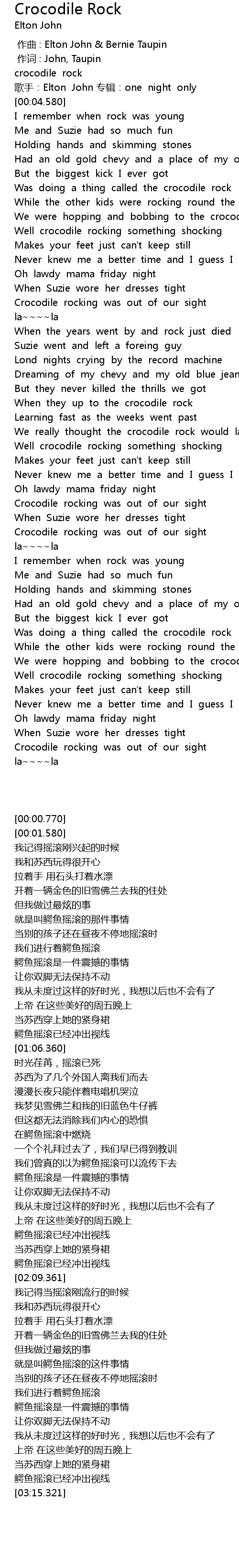 | [02:38.941] | Was doing a thing called the crocodile rock |