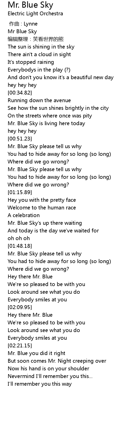 | [01:49.30] | Mr. Blue Sky please tell us why |