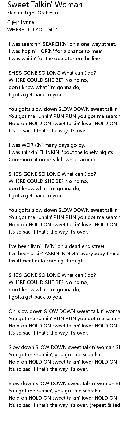 | Slow down SLOW DOWN sweet talkin' woman SLOW DOWN | |