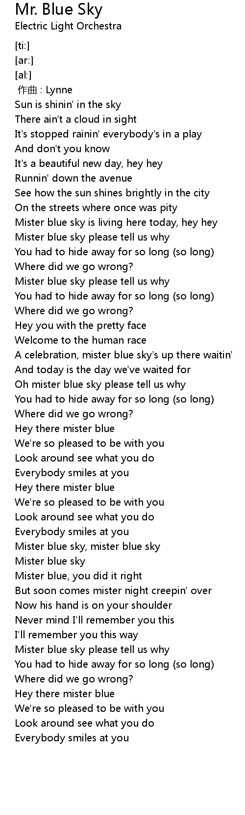 | [02:20.47] | Mister blue sky, mister blue sky |