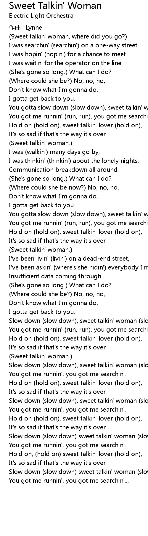 | You gotta slow down slow down, sweet talkin' woman, slow down, | |