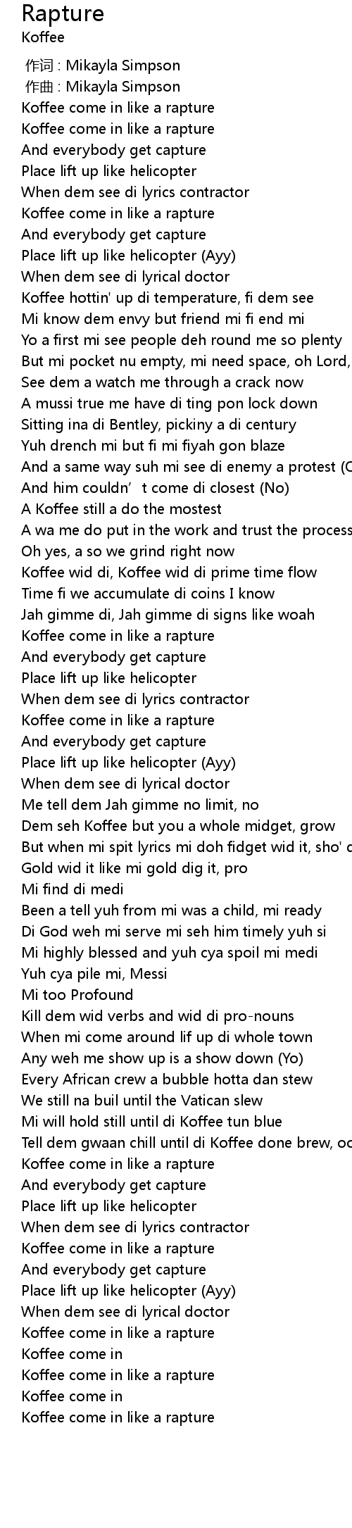 | [02:22.42] | Koffee come in like a rapture |