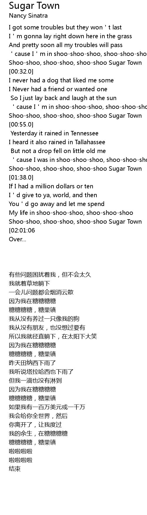| [01:34.20] | Shoo-shoo, shoo-shoo, shoo-shoo Sugar Town |
