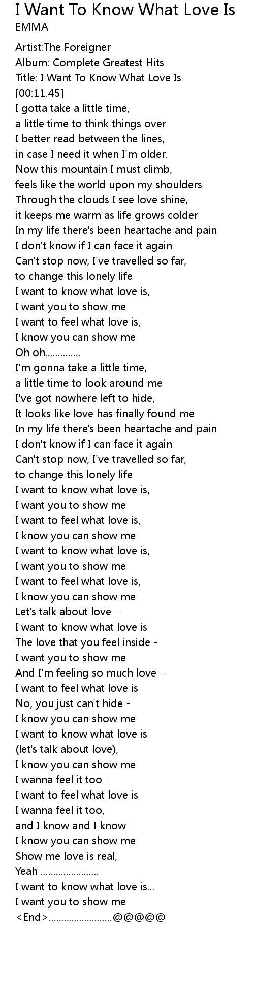 | [00:09.69] | Title: I Want To Know What Love Is |