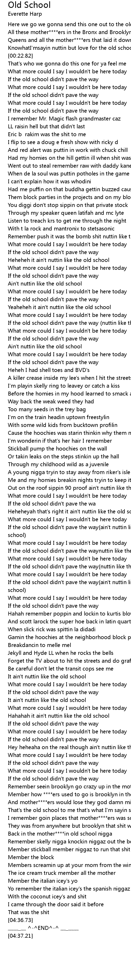 | [03:02.78] | If the old school didn' t pave the way ain' t nuttin like the old school |