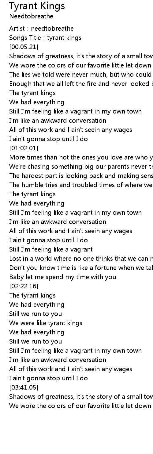 | [01:37.83] | Still I'm feeling like a vagrant in my own town |