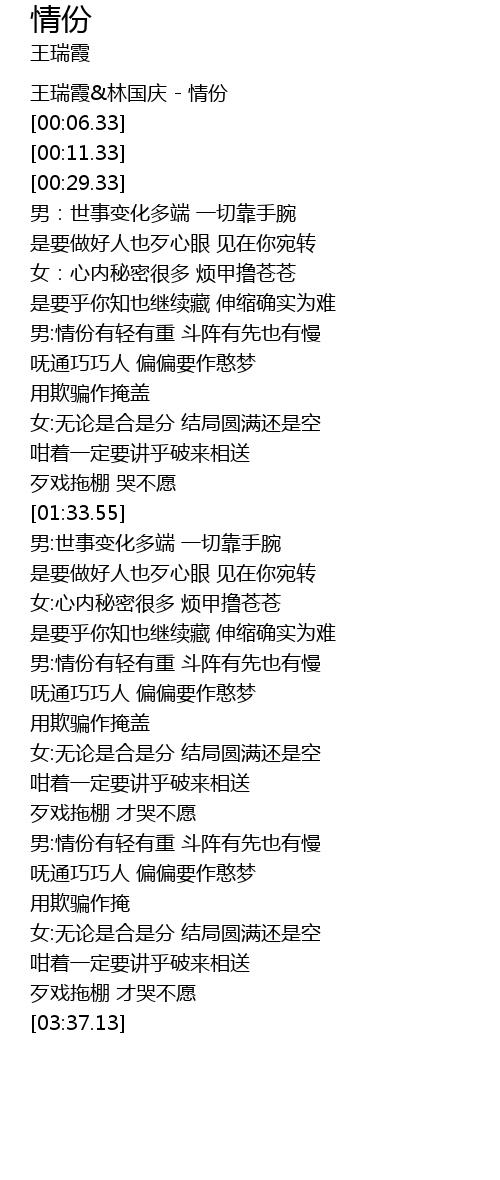 | [00:01.33] | 王瑞霞&林国庆 - 情份 |