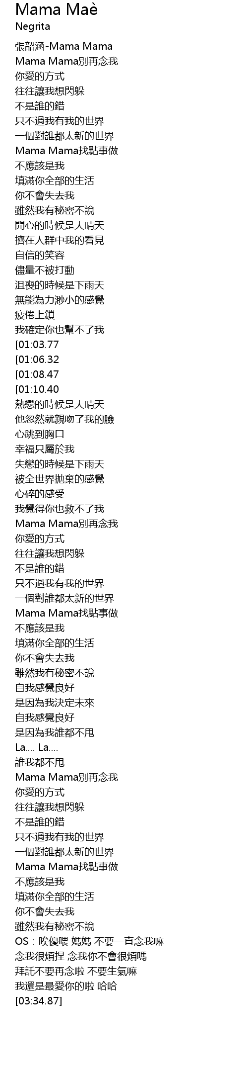 | [00:03.58] | 張韶涵-Mama Mama |