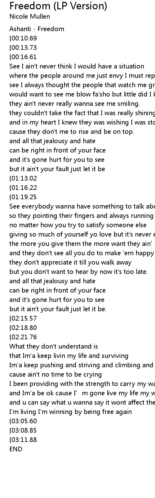 | [01:31.70][01:19.25] | despite what you think Im'a be free cause Im'a be me. |