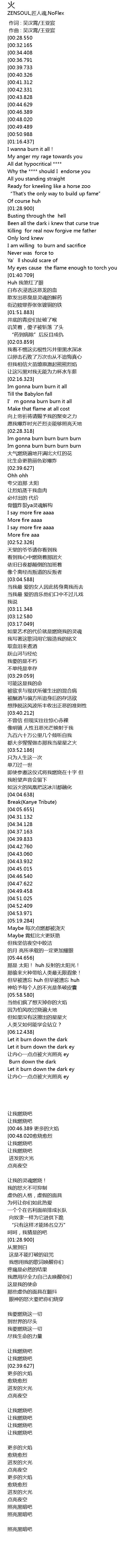 | [01:13.508][00:49.489] | I say more fire aaaa 迸发的火光 |