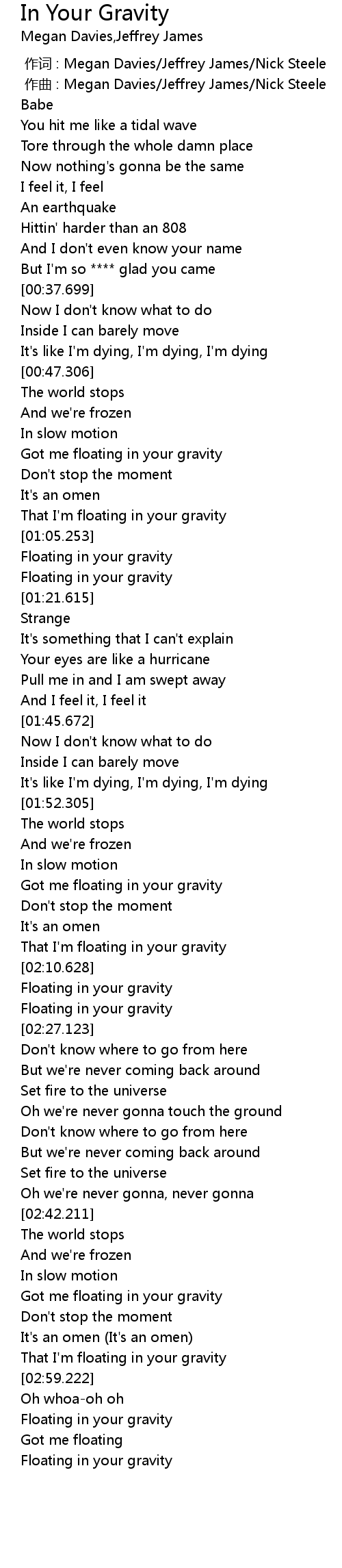 | [00:00.000] | 作词 : Megan Davies/Jeffrey James/Nick Steele |
