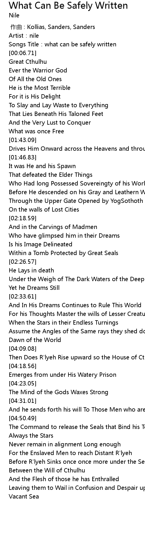 | [05:18.44] | Before R' lyeh Sinks once once more under the Sea Severing the Bond |