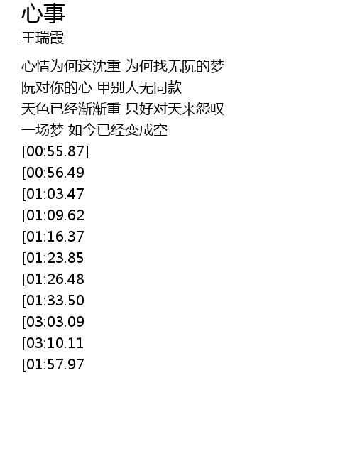 | [02:19.73][00:56.49] | 心事不知位叨藏 痴情犹原一场梦 |