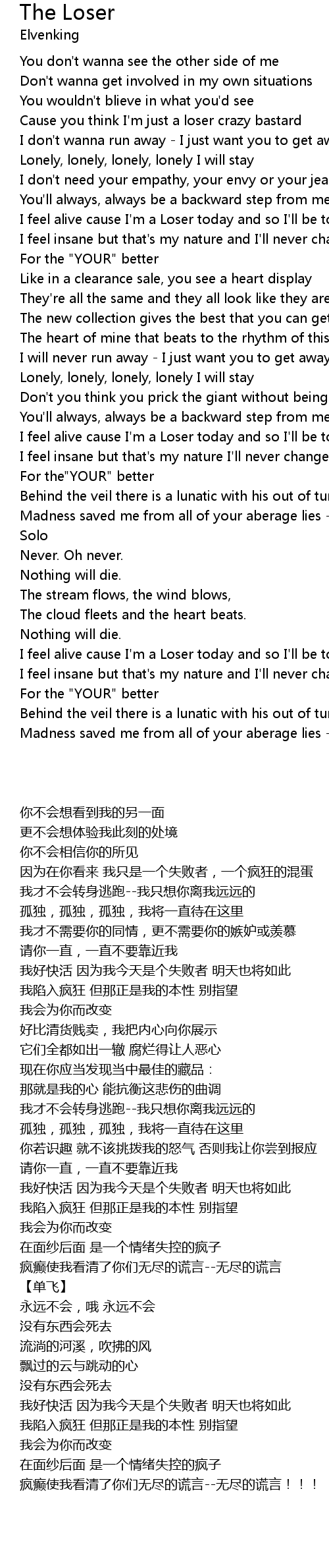 | [02:10.06] | I feel alive cause I' m a Loser today and so I' ll be tomorrow |