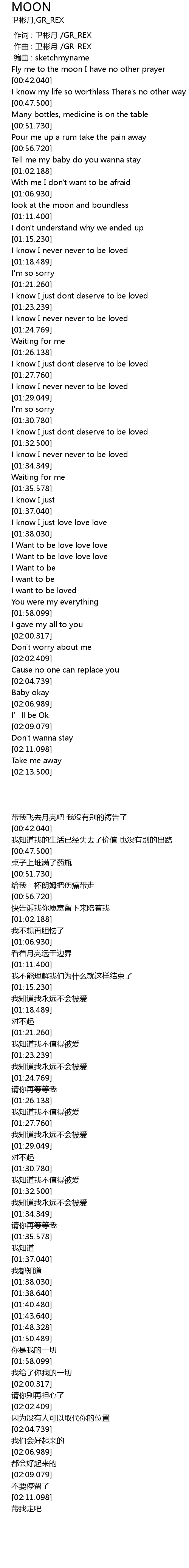 | [00:38.300] | Fly me to the moon I have no other prayer |