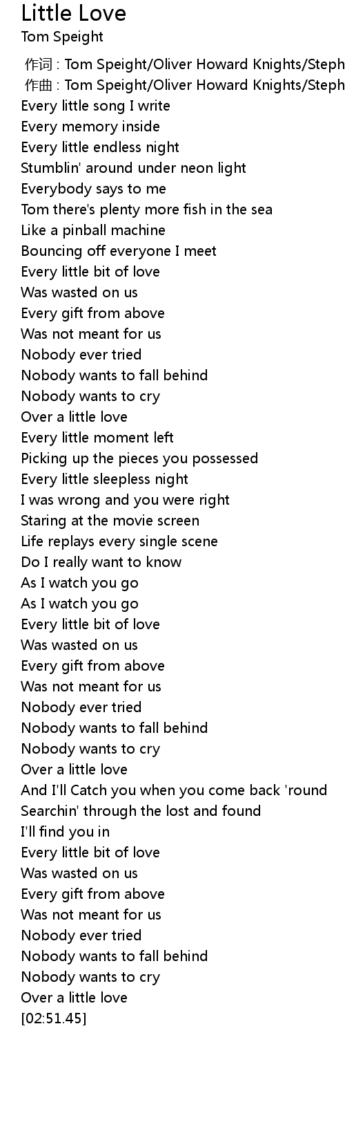 | [00:00.000] | 作词 : Tom Speight/Oliver Howard Knights/Stephan Gale Paridjanian |