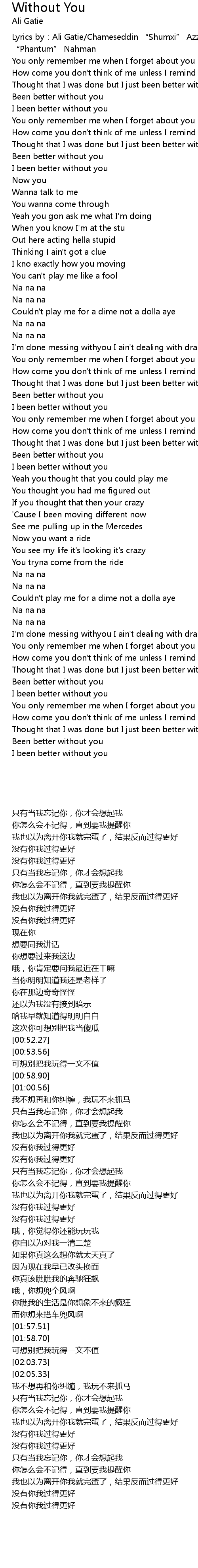 | [02:32.51] | Been better without you |