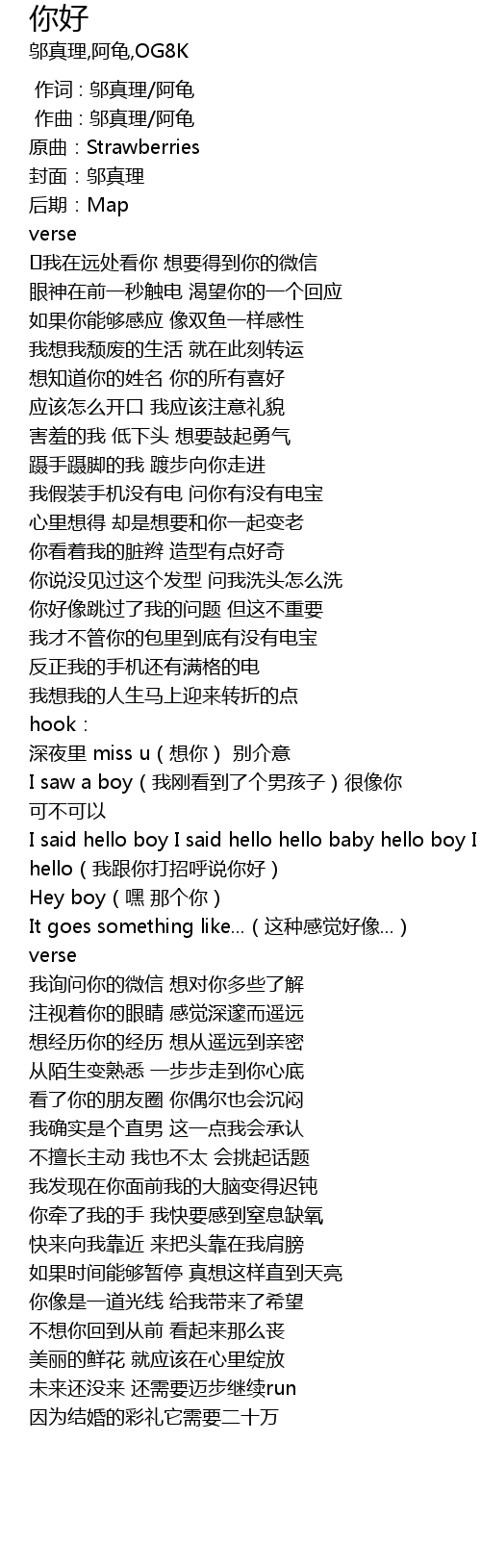 | [01:03.311] | I said hello boy I said hello hello baby hello boy I said hello hello wo gen ni da zhao hu shuo ni hao |