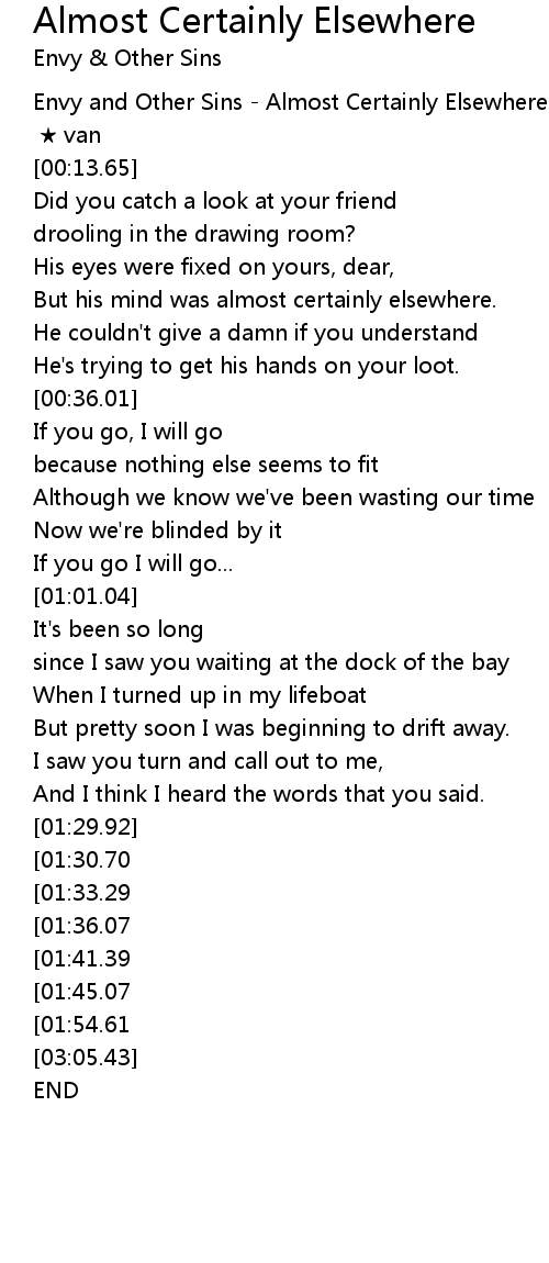 | [00:00.00] | Envy and Other Sins - Almost Certainly Elsewhere |
