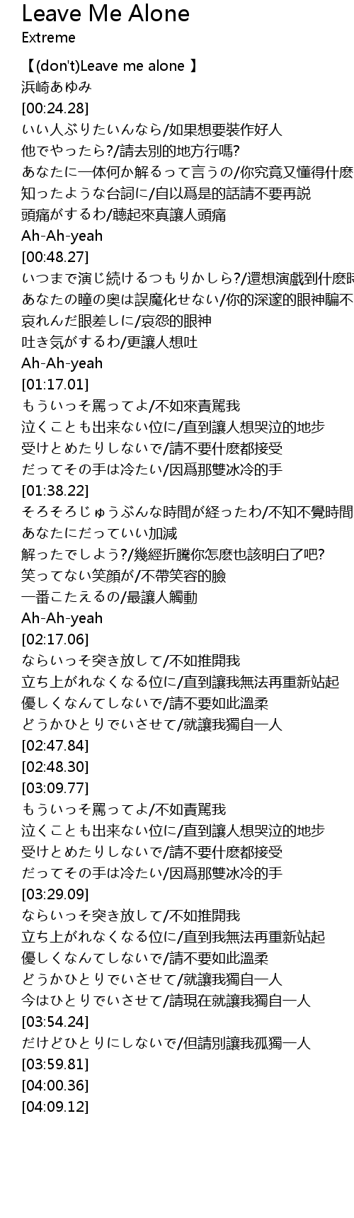 | [03:47.55] | 今はひとりでいさせて/請現在就讓我獨自一人 |