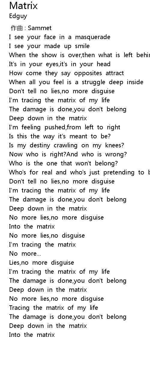 | [00:59.100] | I' m tracing the matrix of my life |