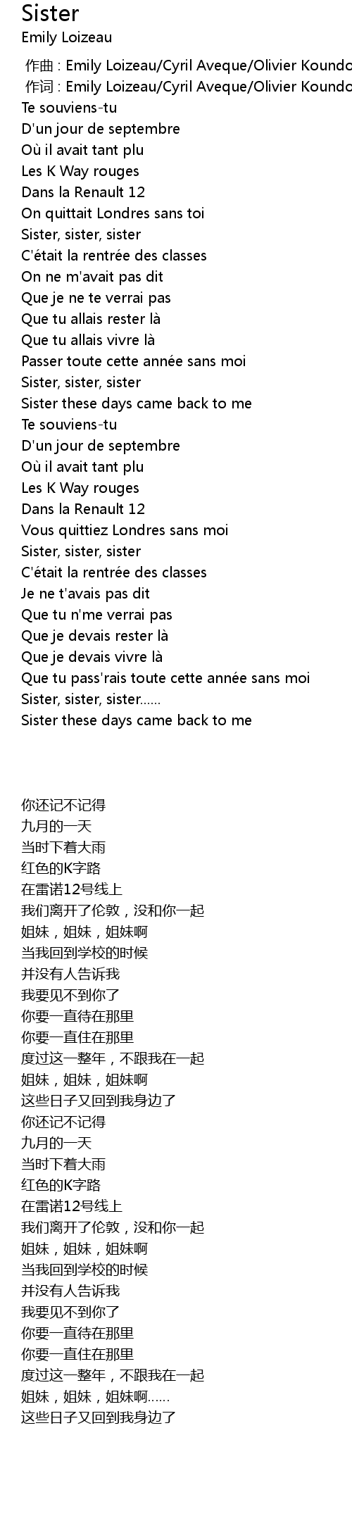 | [00:01.00] | 作词 : Emily Loizeau/Cyril Aveque/Olivier Koundouno |