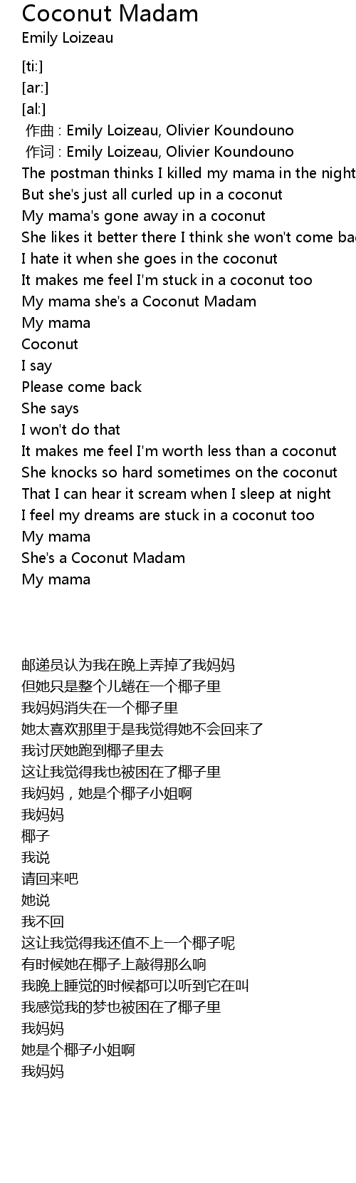 | [00:37.33] | My mama she' s a Coconut Madam |