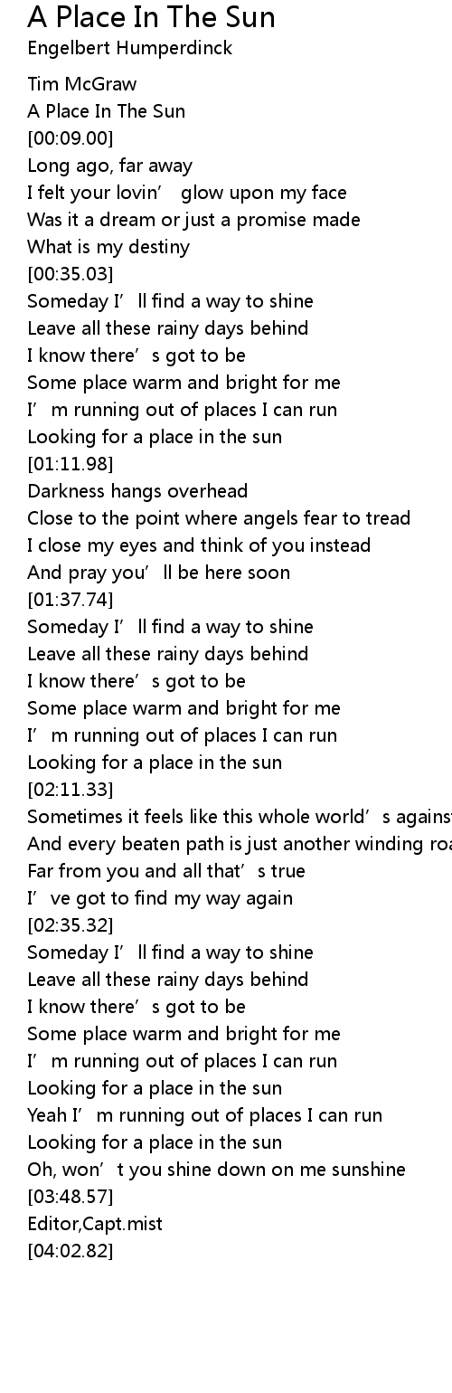 | [03:35.71] | Oh, won' t you shine down on me sunshine |