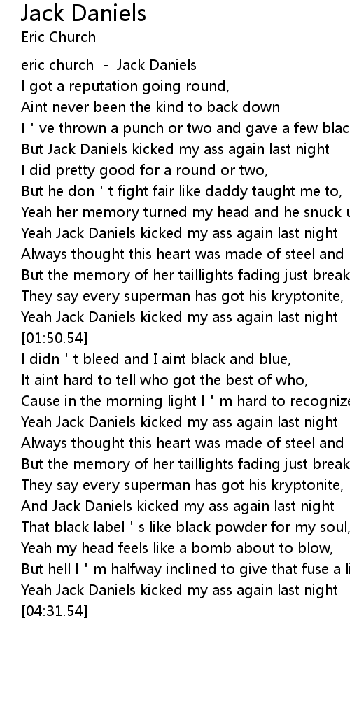 | [00:49.32] | But Jack Daniels kicked my ass again last night |