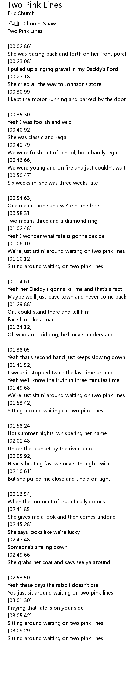 | [01:50.36] | We're just sittin' around waiting on two pink lines |