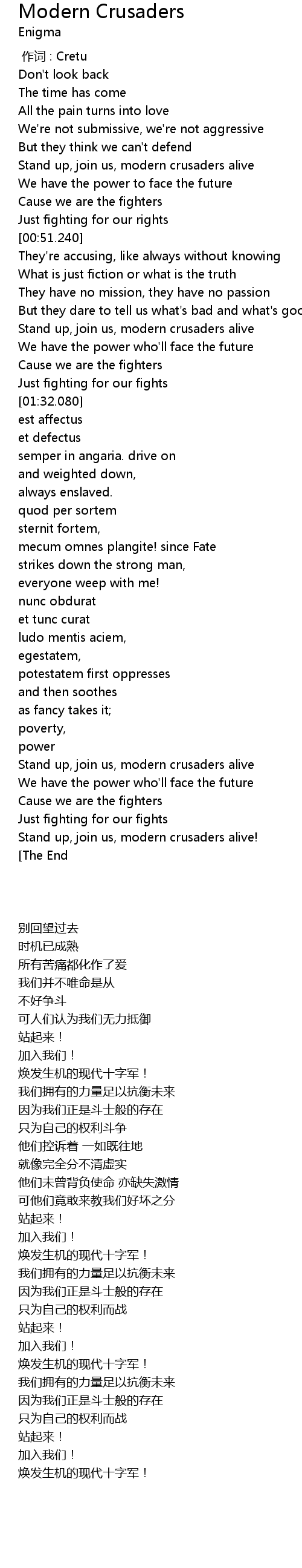 | [00:33.310] | Stand up, join us, modern crusaders alive |