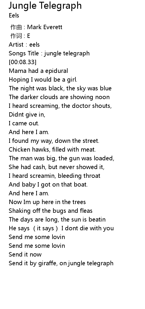 | [00:06.40] | Songs Title: jungle telegraph |