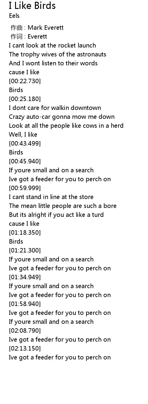 | [01:31.139] | Ive got a feeder for you to perch on |