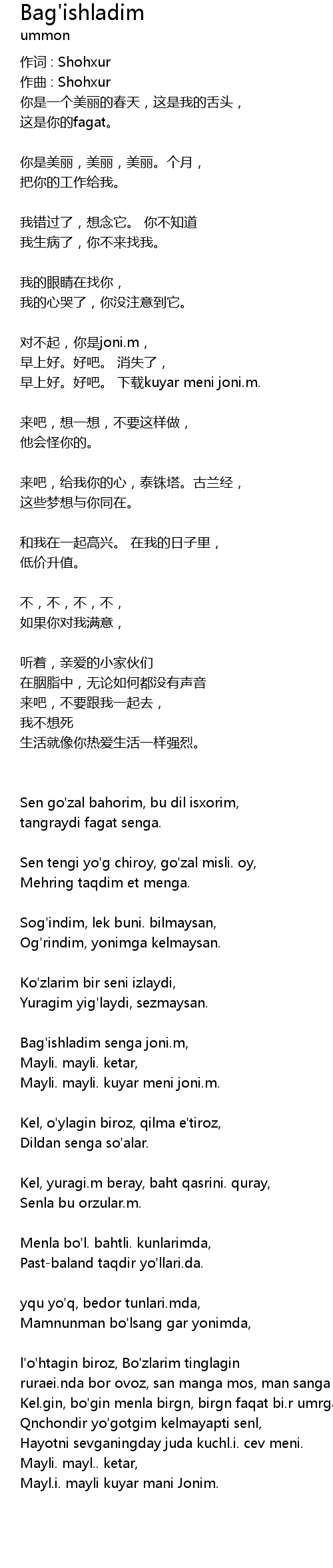 | Sen tengi yo' g chiroy, go' zal misli. oy, | |