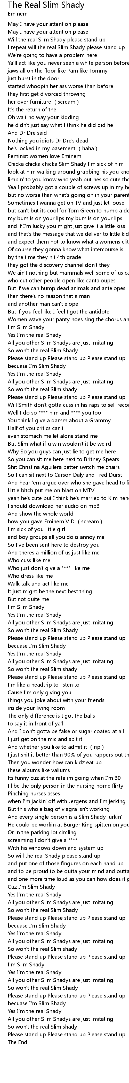 | [00:12.51] | I repeat will the real Slim Shady please stand up |