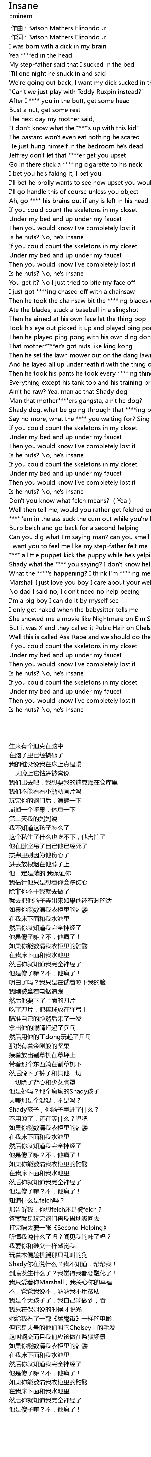 | [01:35.60] | Shady dog, what be going through that ****ing brain of yours? |
