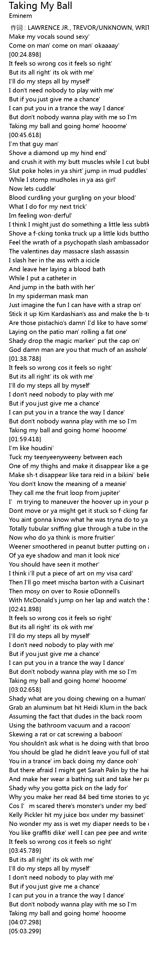| [00:52.698] | Slut poke holes in ya shirt' jump in mud puddles' |