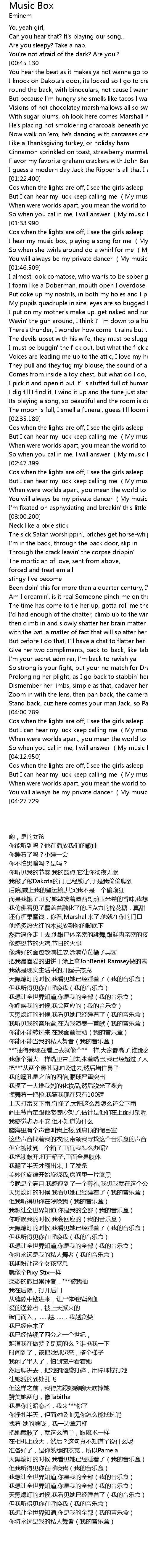 | [02:35.689] | Cos when the lights are off, I see the girls asleep My music box |