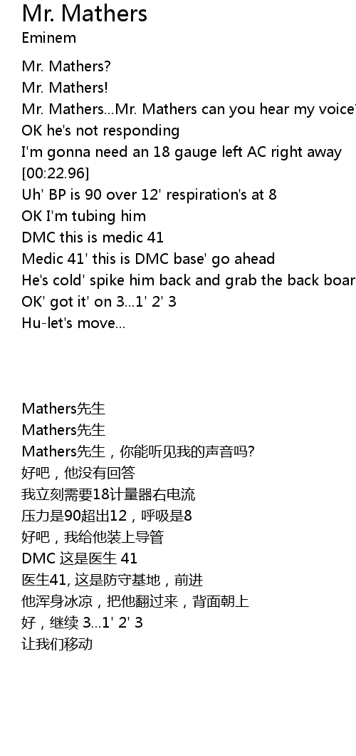 | [00:10.59] | Mr. Mathers...Mr. Mathers can you hear my voice? |