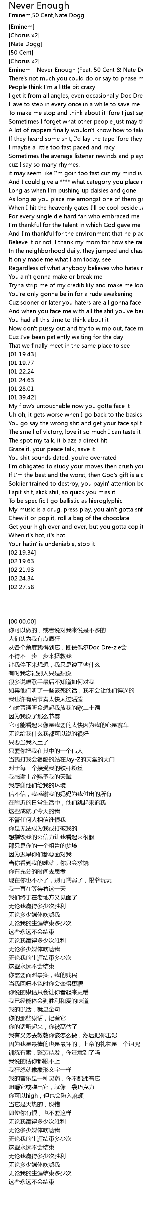 | [00:00.00] | Eminem - Never Enough (Feat. 50 Cent & Nate Dogg) |