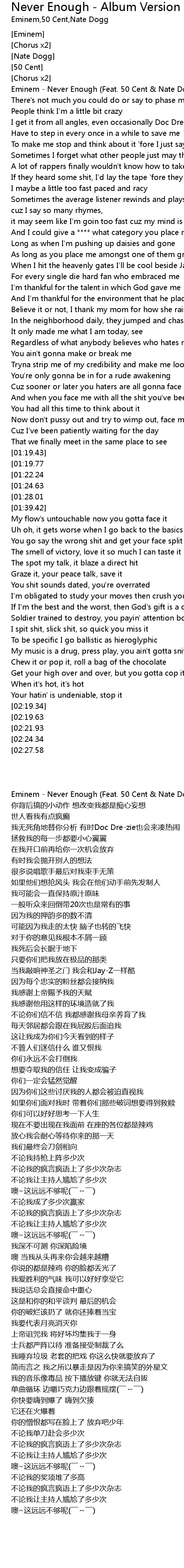 | [00:00.00] | Eminem - Never Enough (Feat. 50 Cent & Nate Dogg) |